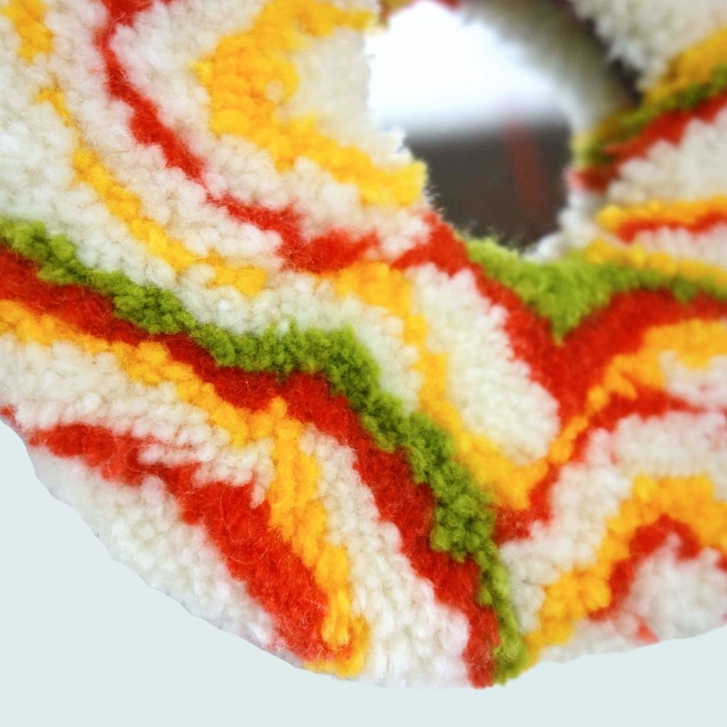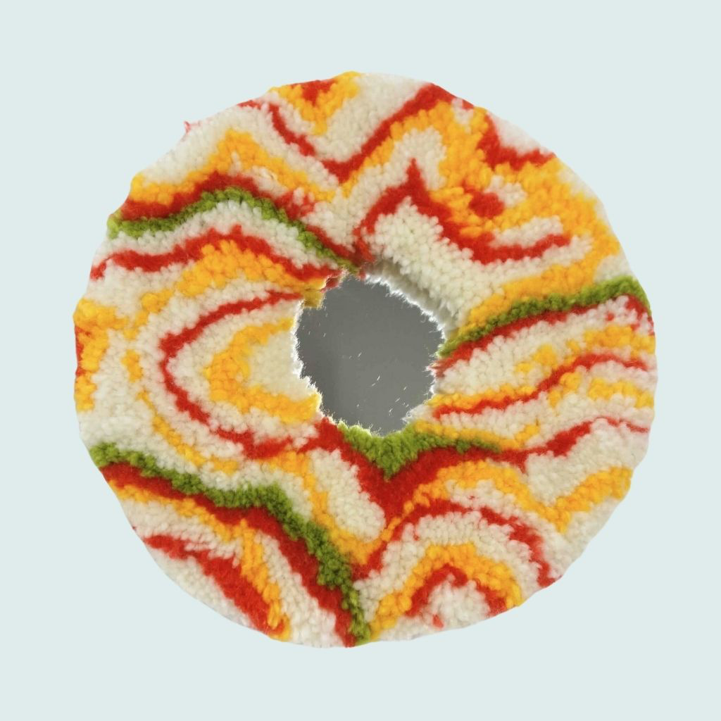 « Psychedelia I » Miroir tufté. Laine acrylique et arrière en carton avec système d’attache. Dimensions : 17cm de diamètre