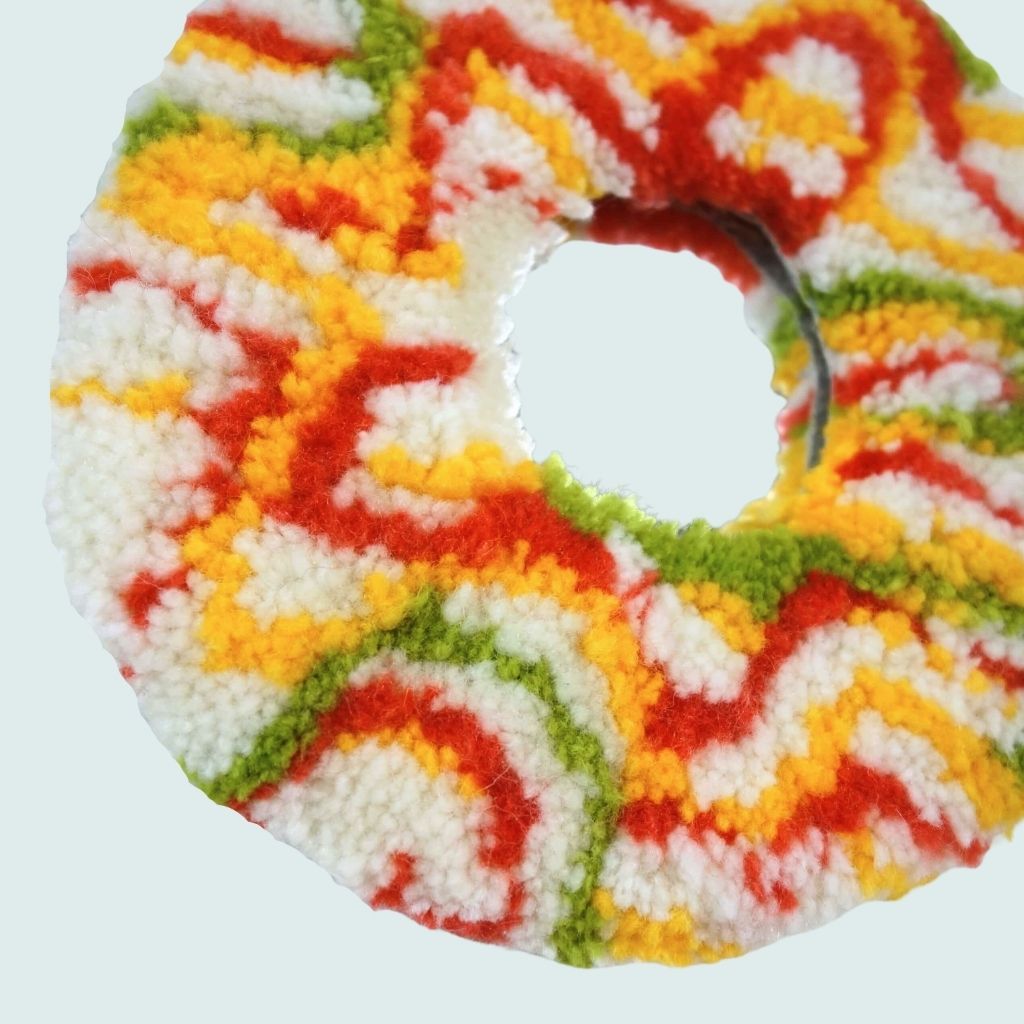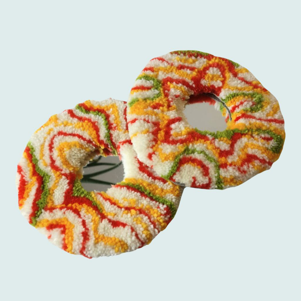 « Psychedelia 2 » Miroir tufté. Laine acrylique et arrière en carton avec système d’attache. Dimensions : 17cm de diamètre